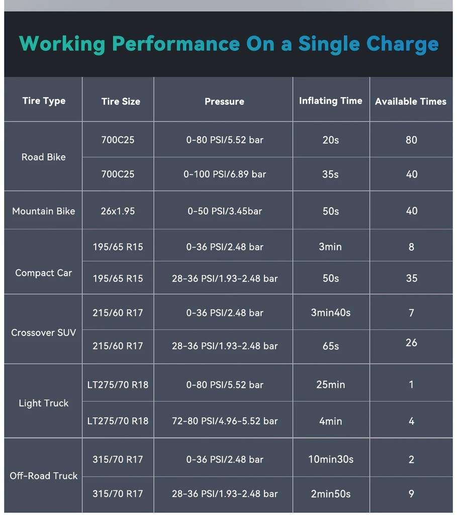 W każdym innym przypadku duża pompka elektryczna w domu to jest przydatny gadżet. Napompujecie nią nie tylko swoje rowery i to wielokrotnie (zobacz tabelę poniżej), ale i samochody. A jeśli przypadkowo jesteś właścicielem Cybertrucku od Tesli, to producent deklaruje, że też da radę. Traktora nie ma w zestawieniu i sam też nie próbowałem go znaleźć żeby sprawdzić.