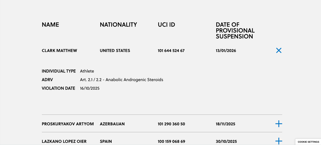 UCI poinformowała o tymczasowym zawieszeniu 41-letniego Matthew Clarka, Mistrza Świata UCI Gran Fondo w jeździe na czas w kategorii 40–44. Decyzja zapadła po pozytywnym wyniku kontroli antydopingowej przeprowadzonej podczas mistrzostw świata Gran Fondo w Australii.