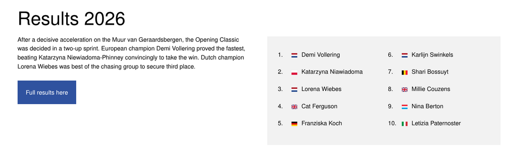 Katarzyna Niewiadoma-Phinney zajęła drugie miejsce w otwierającym sezon klasyku Omloop het Nieuwsblad z Gandawy do Ninove, przegrywając jedynie z mistrzynią Europy Demi Vollering po sprincie z dwuosobowej ucieczki.